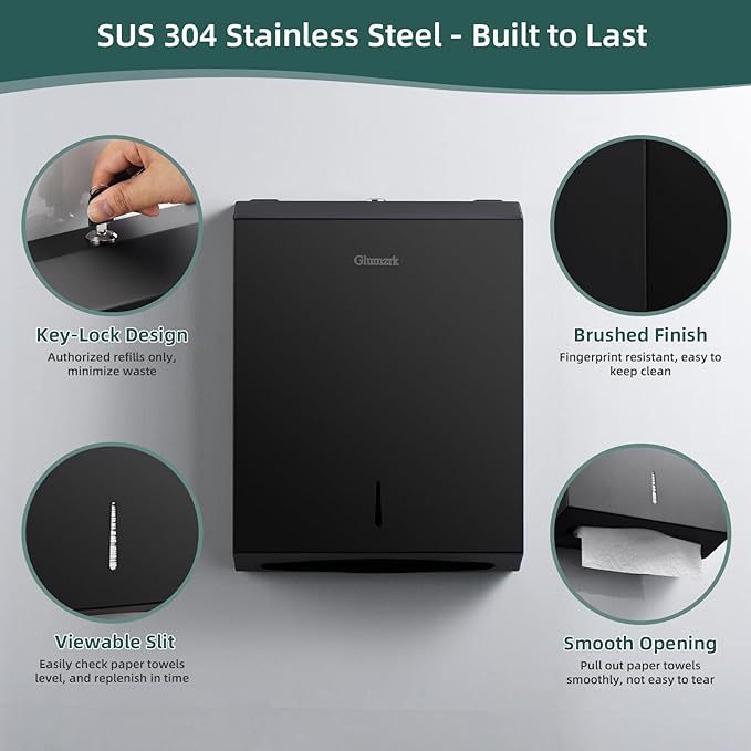 - 【Practical Design for Use】The key lock mechanism keeps refills secure(in public places), while the cut-out observation window lets you check towel levels at a glance—so you’ll always know when it’s time to refill. And the wide curved paper outlet designed to prevent jams and tears, so you can pull out towels smoothly every single time. Simple but practical, less waste and more efficiency.