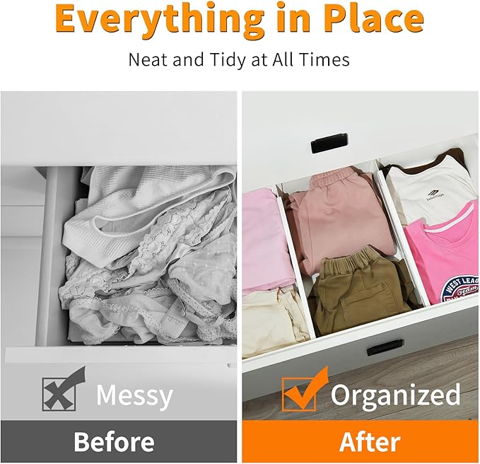 - Scratch-Proof & Non-Slip Design: Reinforced ABS plastic dividers with silicone end caps protect delicate surfaces from scratches. Non-slip pads grip tightly without residue, even when moving heavy items—ideal for renters, RVs, or baby nursery dressers. Stack vertically/horizontally for deep cabinet storage!