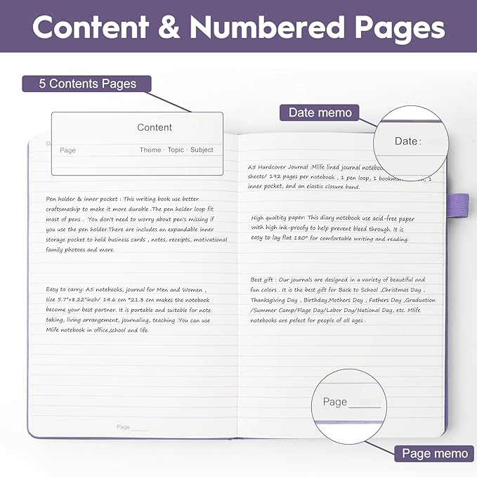 - 【Humanized Design】5 Contents Pages for detailed indexing. No more worrying about not having enough index pages; 1 Exquisite ribbon bookmarks to mark your place effortlessly; 1 Elastic closure band to keep your pages safe; 1 pen holder for convenient storage.; 1 Back Inner pocket for storing notes, receipts, or small items.
