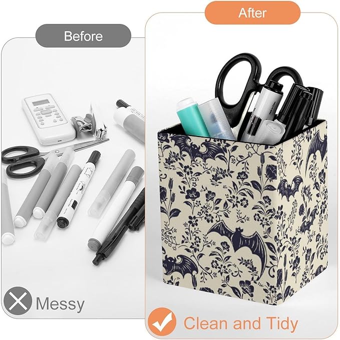 Square Pen Holder & Pencil Organizer for Desk - Office Storage Organizer, Markers/Makeup Brushes/Scissors Holder, Compact Desk Decor Accessories for Home Classroom School(Goth Bats)
