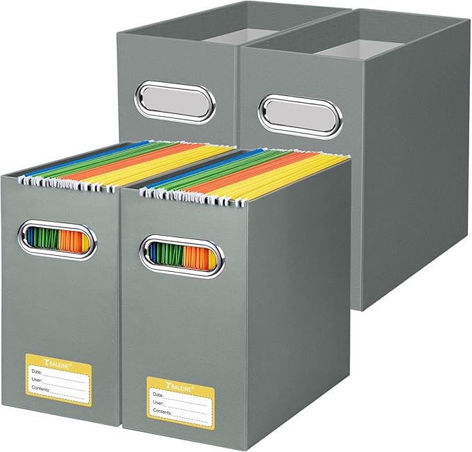 BALEINE File Organizer Box, Cardboard File Folder Organizer with Handle for Letter Size, Portable Collapsible Hanging Filing Box for Home Office Document Storage (4 Pack, Grey)