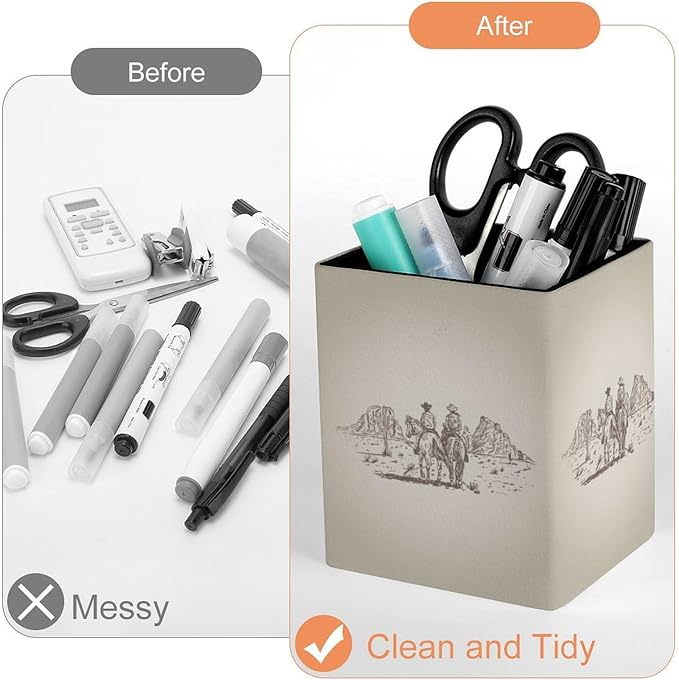 Square Pen Holder & Pencil Organizer for Desk - Office Storage Organizer , Markers/Makeup Brushes/Scissors Holder, Compact Desk Decor Accessories for Home Classroom School(Western Desert Cowboy)