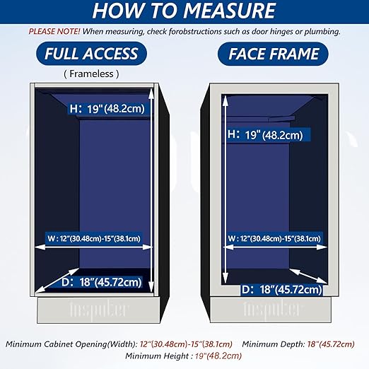 - Minimum cabinet size required: 18" D x 12" W x 21" H; slide-out trash can size: 10.6β W x 16β D x 17.7β H (height of trash can included). Note: The screws that link to the cabinet door are 12mm (0.47β), so the minimum thickness of the door needs to be 15mm (0.59β) or more. When using under the sink and in cabinets, please measure the size and space to make sure the product fits in your cabinets