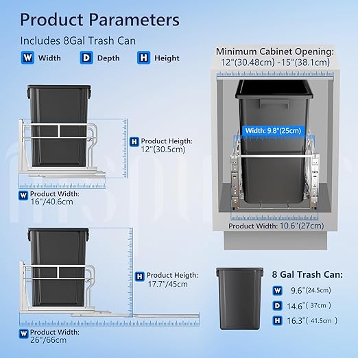 - Heavy Ducty Material: The pull out trash can under cabinet is made of heavy duty structural steel with surface nano-painting technology, which is more resistant to corrosion and rust than normal painting technology, and lasts longer. The under cabinet trash can pull out have enhanced weight capacity, which can withstand up to 100 pounds, no need to worry about bending the slides