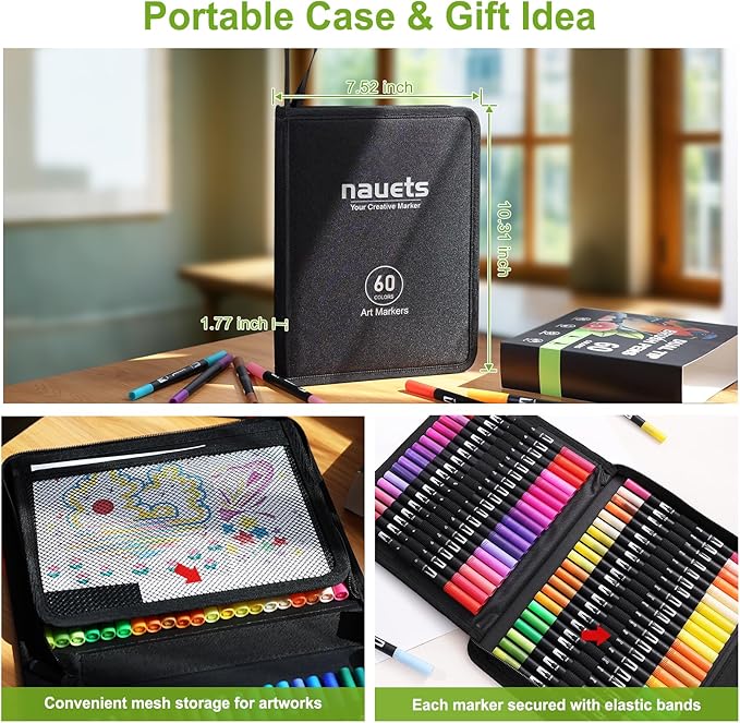 nauets 60 Colors Brush & Fine Dual Tip Watercolor Markers Set for Kids Adults Coloring Books No Bleeding Paint Pens For Drawing Note taking Planner Calligraphy Journaling Card Making Art Supplies