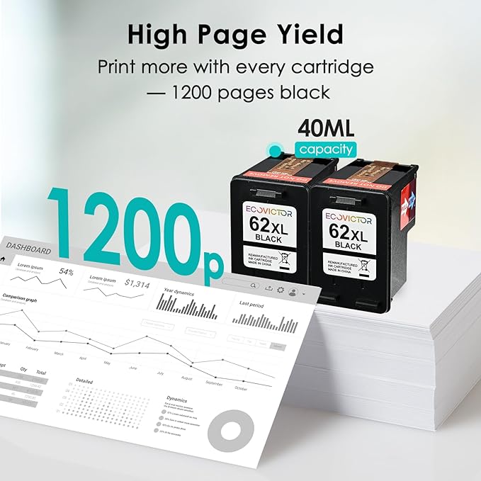 - Vivid, Professional Results: Formulated with premium-quality ink, our black printer ink 62xl replacement for hp ink 62xl black delivers crisp, clear text and rich, vibrant images. EcoVictor printer ink 62xl for hp ink 62 black is perfect for everyday documents, schoolwork, creative projects, and photos—fade-resistant and smudge-proof.