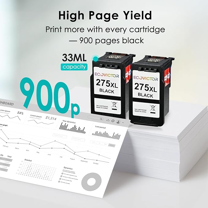 - Smart Chip, Easy Monitoring: Our compatible with canon ink 275 are equipped with the latest smart chip. EcoVictor for canon 275 black ink ensures full compatibility with Canon printers. Monitor ink levels in real time and avoid unexpected interruptions—EcoVictor 275 black ink cartridges for canon printers are ideal for busy households and workplaces.