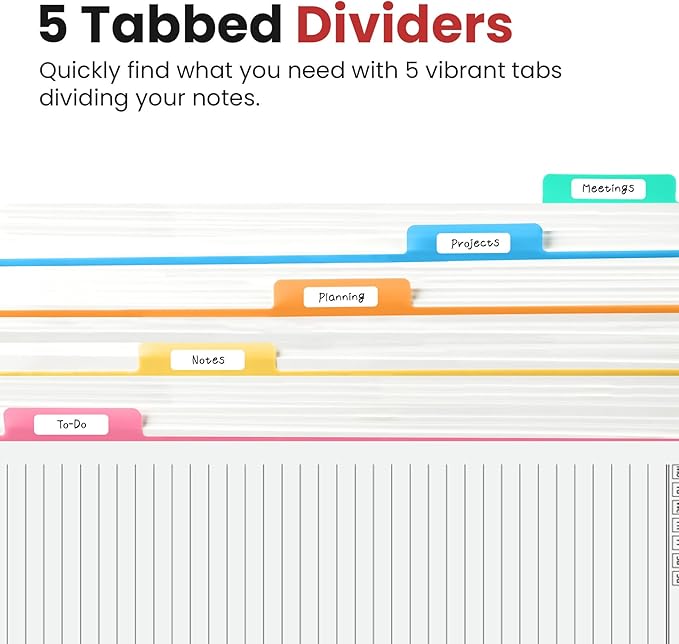 - 5 Subject Notebook with Dividers & Tabs: Stay organized with this 5 subject notebook, featuring 5 removable plastic dividers with tabs and 10 self-adhesive labels. These writable tabs make it easy to customize and categorize your notes for different subjects or projects—perfect for both school supplies and work planning.