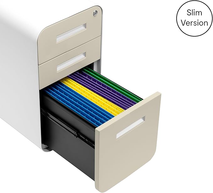Laura Davidson Furniture Stockpile Slim 3-Drawer Mobile File Cabinet with Lock - Under Desk Metal Filing Cabinet, Legal/Letter File Folders, Wheels & Stationary Feet, Assembled, Ivory Faceplate