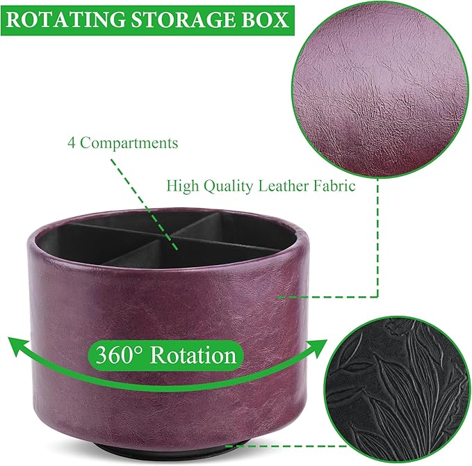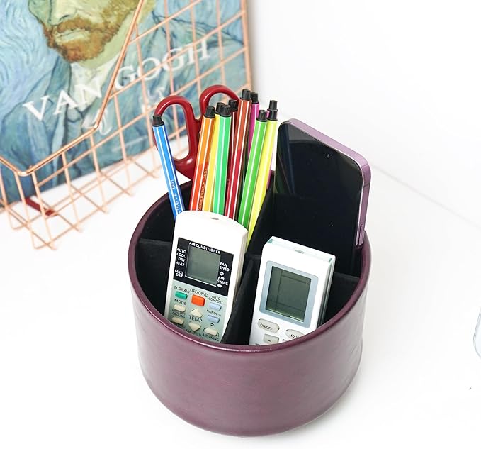 Hennaja Round Leather Art Supply Organizer,Remote Control Holder,360 Degree Spinning,Multi-Functional Pencil Holder,4 Compartments Desktop Stationary Organizer(1-Oil Brown)