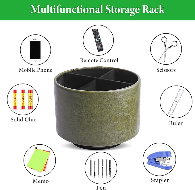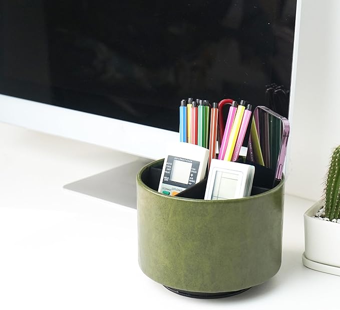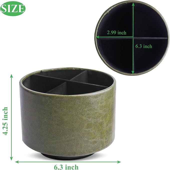 Hennaja Round Leather Art Supply Organizer,Remote Control Holder,360 Degree Spinning,Multi-Functional Pencil Holder,4 Compartments Desktop Stationary Organizer(1-Oil Green)