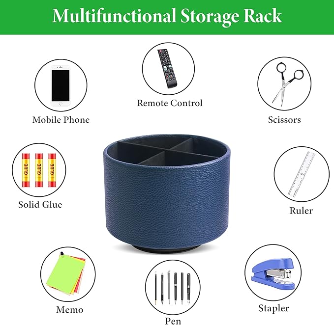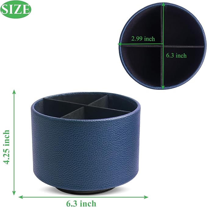 Hennaja Round Leather Art Supply Organizer,Remote Control Holder,360 Degree Spinning,Multi-Functional Pencil Holder,4 Compartments Desktop Stationary Organizer(1-Lichee Blue)