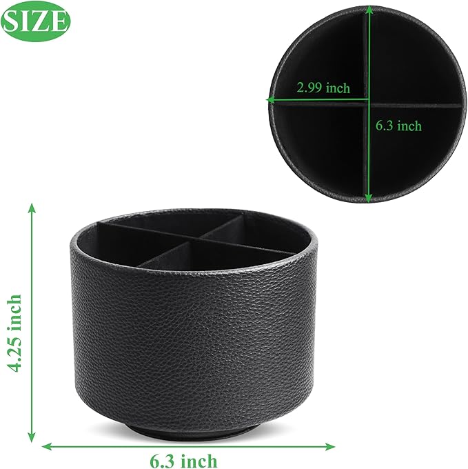 Hennaja Round Leather Art Supply Organizer,Remote Control Holder,360 Degree Spinning,Multi-Functional Pencil Holder,4 Compartments Desktop Stationary Organizer(1-Lichee Black)