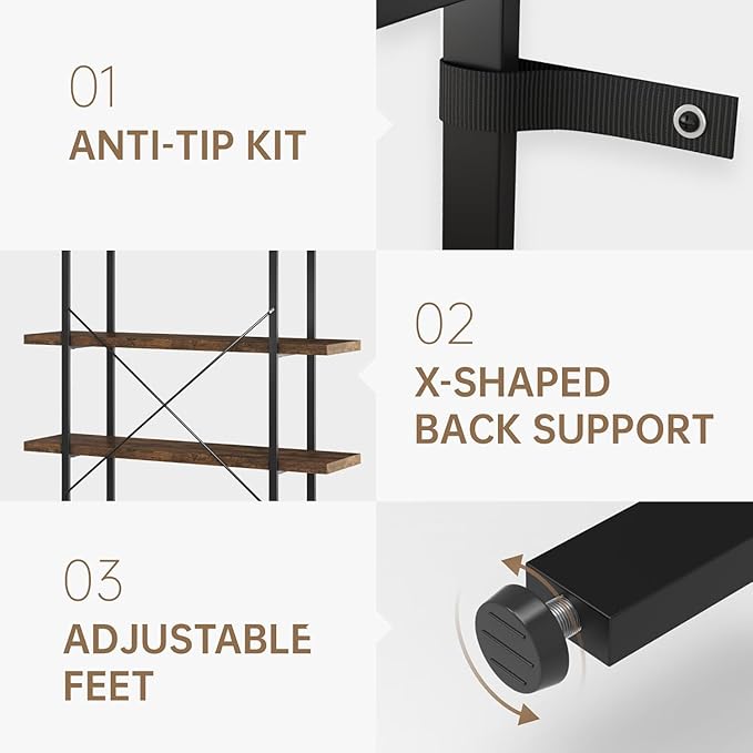 - Industrial Style & Versatile Design: Crafted with sturdy metal frame & rustic brown wood shelves, this 4-tier bookshelf blends industrial charm with modern functionality. Perfect for living rooms, bedrooms, offices, and kitchens—complements farmhouse, rustic, or contemporary decor