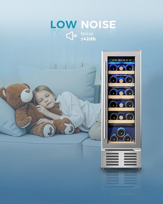 - 【Spacious & Flexible Storage】As a versatile wine cooler refrigerator, it holds 18 bottles with 6 adjustable beech wood shelves, ideal for wine coolers for bottles in small spaces. The wine fridge only takes 11.6''W x 22.4''D x 34.3''H of your space. It can be installed as a built-in or a freestanding wine cooler, offering flexible placement options to suit your space and style.