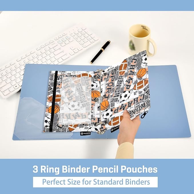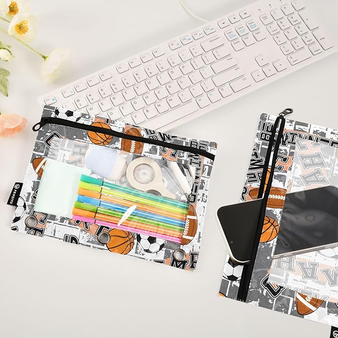 ZAZYXTJ Basketball Football Ball Binder Pencil Pouchs 3 Ring with Zipper Clear Window Office Organizers bag for School Students Teacher Supplies 2 Pack