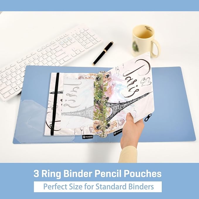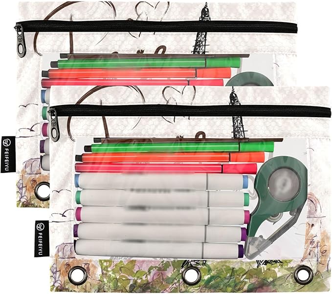ZAZYXTJ Eiffel Tower Binder Pencil Pouchs 3 Ring with Zipper Clear Window Office Organizers bag for School Students Teacher Supplies 2 Pack
