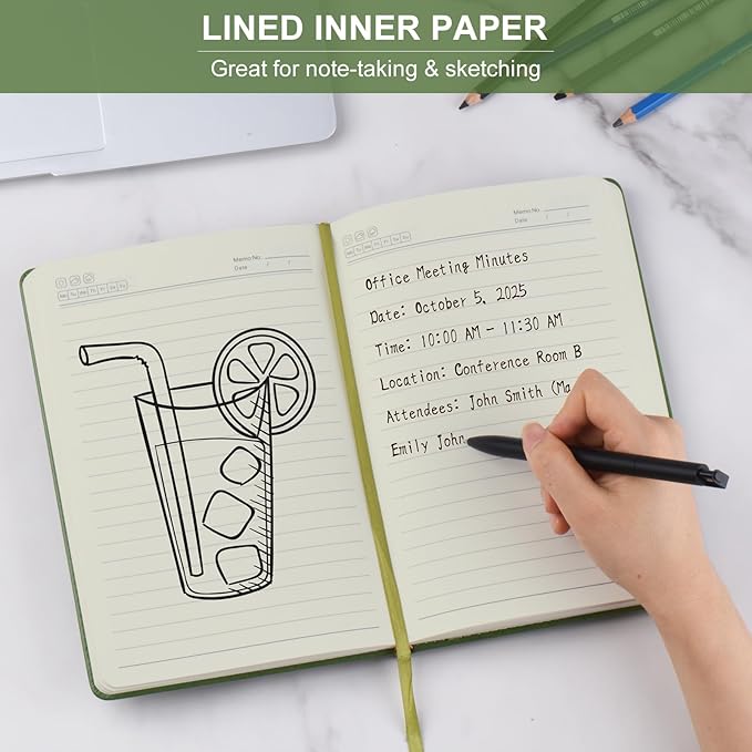 - 192 Pages Lined Journal Notebooks: 6 light green hardcover notebook, 192 pages/96 sheets per notebook (1152 pages/ 576 sheets in total), adequate for work, meeting, studying. The paper of the leather notebook is thick enough that ink won't bleed through. The light yellow paper is more eyes comforting, release eyes burden when writing. It is the ideal notebook for work, school, meeting, travel and dairy