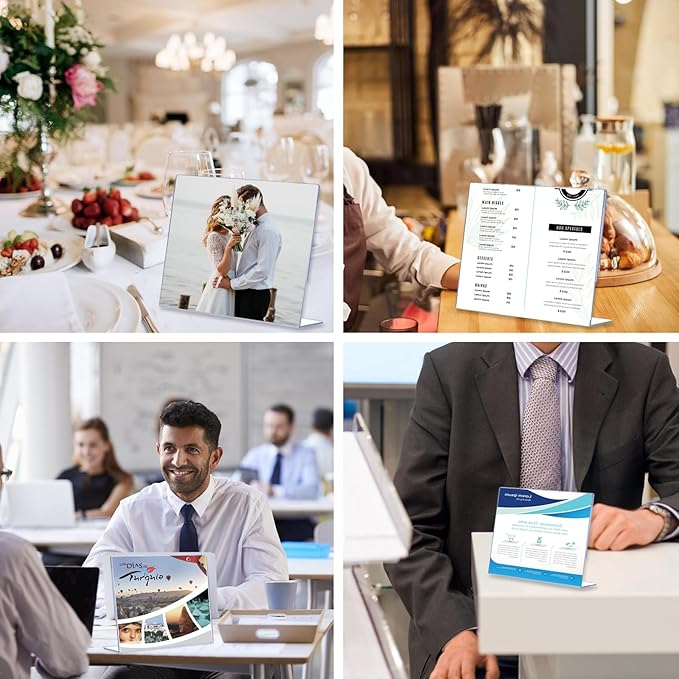 - 12 Pack Durable 11x8.5 Plastic Sign Holders: Designed with a slanted back and L shape base, these sign holders securely display flyers, menus, and documents in high-traffic areas. The anti-slip silicone pads ensure stability on countertops or desks, preventing slips even during busy hours. Perfect for restaurants, retail stores, offices, and events.