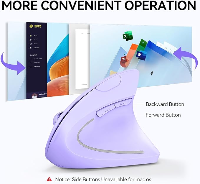 - 【Ergonomic Design】The wireless mouse's ergonomic design offers ultimate comfort by placing your palm at a near-vertical angle on the desktop, reducing pressure and pain on your wrist caused by prolonged inverted mouse usage (Note: Mouse is designed for right-handed use only).