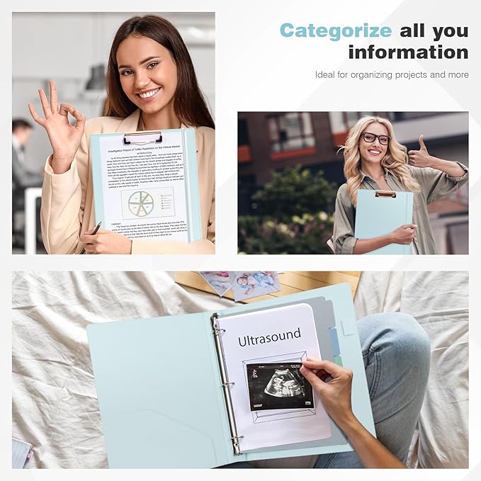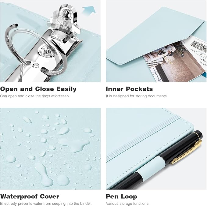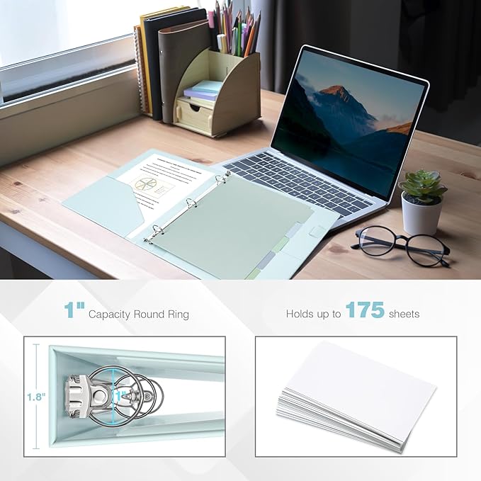 - 【All-in-One Organizer】1" round rings securely hold 200+ sheets, paired with built-in pockets for letter-size docs and loose papers. Includes a 5 dividers with tabs + matching stickers for instant labeling. Quick-access clipboard binder keeps pages stable while writing—perfect for desks, backpacks, or client meetings.