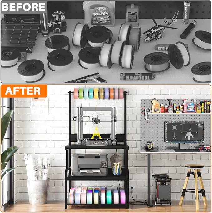- High-Capacity Filament Storage Organizer: Measuring 29.1"L x 22.8"W x 60"H, this stand stores over 60 spools with an adjustable upper tube for quick access to 10 spools, reinforced lower shelves for bulk filament storage, and a versatile middle shelf that can be adjusted to hold small printers or creative 3D prints.