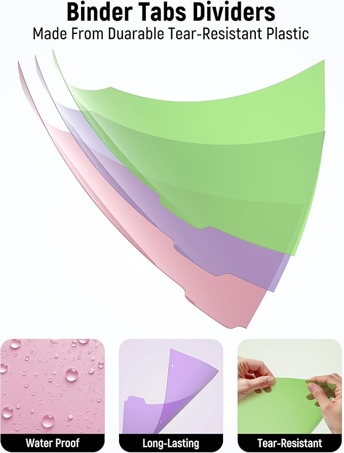 - Reusable and Tear-Resistant: These dividers for 3 ring binder are made of high-quality durable plastic. Our binder tabs dividers are tear-resistant and waterproof, which allows you to use in long time without easy damage. You can easily write and erase, and replace labels for frequent reuse.