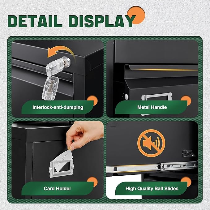 - 〖Detail Design〗The drawers feature an interlocking mechanism that allows only one drawer to open at a time, preventing tipping and ensuring stability. Equipped with high-quality ball-bearing slides, the cabinet operates smoothly, effortlessly, and with reduced noise.