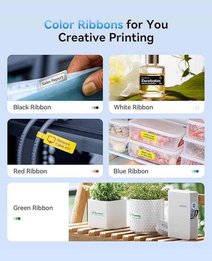 - Color Printing: 5 colors of ribbon and more than 20 types of label paper you can choose, can be matched with the best printing results as you wish. It is great for price tags, personal item identification, food date marking, cable identification, and more. Make your home office more eye-catching and organized