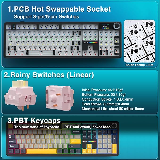 - Smart Display Screen & Multi-function Knob: AULA F108 Pro wireless mechanical keyboard has built-in intelligent TFT color display screen, which can be used as an interactive interface for real-time updating and customization. The high-definition display and multi-function knobs are designed to make it easy to switch and update custom Gif images, volume, date and time, battery status, backlight and connection modes for greater ease of use(Note: You need to download the software under windows system and keep in wired mode to set the screen image/GIF, calibrate the date and time. The screen has a transparent protective film that can be torn off for use)