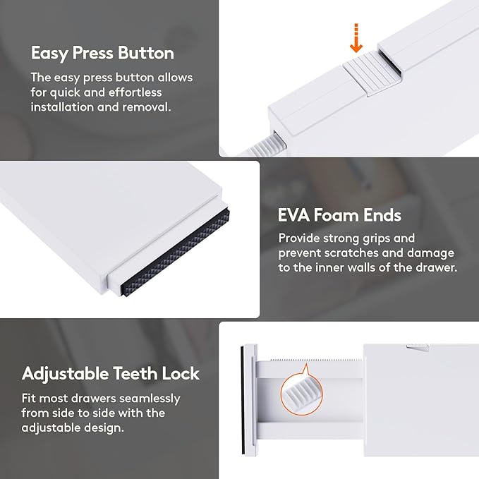 - Easy to Install: To adjust the length, press the top button before placing the drawer organizer, and then stretch it out again to secure it tightly. The strong spring tension keeps each organizer upright and secure. When retracting, press the top button and push in the stretched side