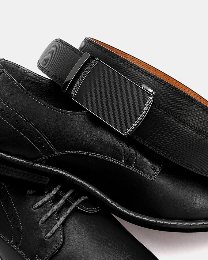 • Effortless to Use: Experience the ultimate convenience with our black leather belt. Simply slide it into the sliding buckle, pull it through, and the click-it buckle automatically locks in place. Releasing the belt is just as easy - gently push the lever on the side of the automatic buckle, and the lock snaps shut. Enjoy the seamless simplicity and smoothness of our ratchet belt design.