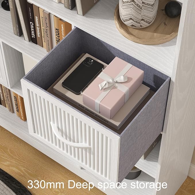 - 3 Foldable Fabric Drawers: This bookcase with drawers features three foldable fabric bins with adjustable placement, allowing you to neatly tuck away clutter while keeping essentials within reach. The flexible shelving design helps you personalize your bookshelf with storage, balancing open display and hidden organization for a clean and stylish look