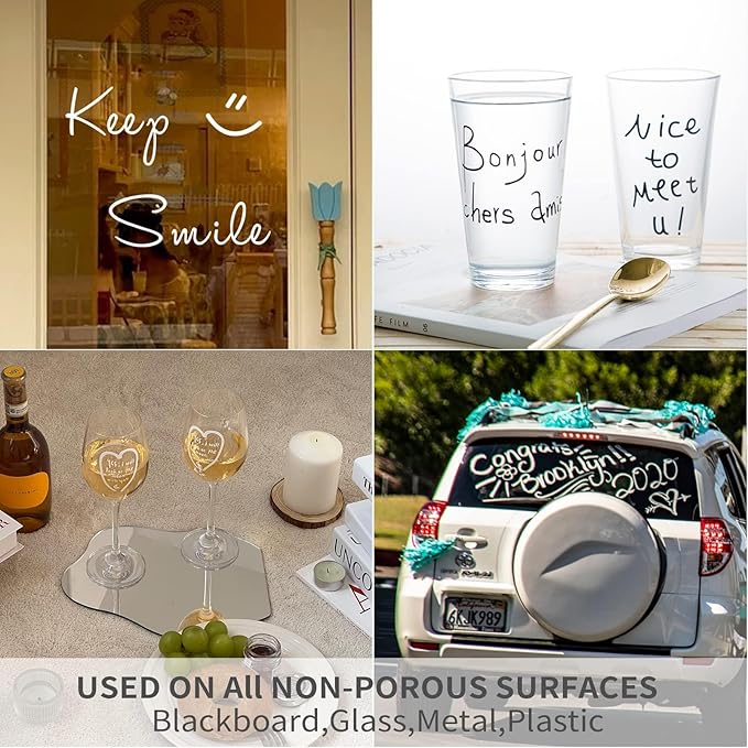 - EASY TO ERASE & REUSE: Designed as wet erase markers, these pens wipe clean with just a damp cloth, making them ideal for chalkboard calendars, car decorations, and more. Enjoy mess-free creativity every time.