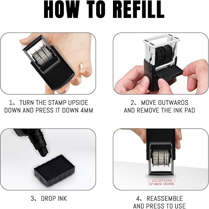 - Quick-Dry Refill Ink Signature Date Stamp: This Refillable Date Stamp for business comes with the re-inkable and replaceable built-in cartridge, Self inking technology double the impressions, easy to refill ink for another thousands of bright & crisp impressions.