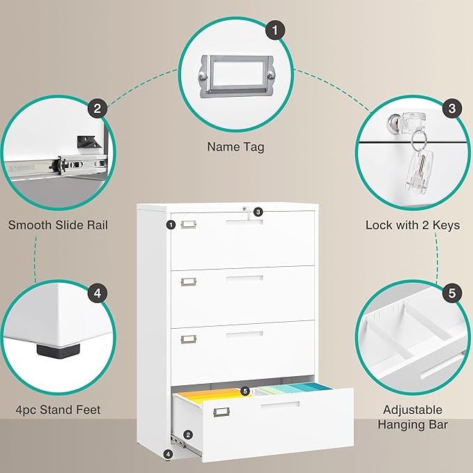- 【Ample Storage Space】: White metal file cabinet with drawer features deep and spacious drawers on full extension and smooth silent rails, providing enough space to store all different size documents, such as Letter/Legal/A4 size. The filing cabinet comes with removable and adjustable hanging rods to meet most daily needs. to help you keep your files organized. Opens and closes seamlessly.