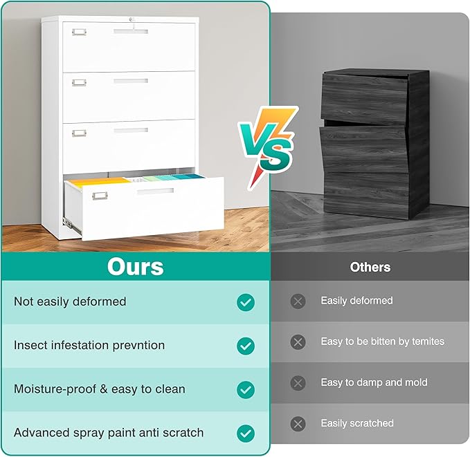 - 【Wide File Cabinet】: Deep & Wide White lateral file cabinet is sturdy and durable, with an all-metal design; coated with electrostatic phosphorus-free epoxy spray coating, making it very strong and resistant to corrosion and rust; the top of the office vertical file cabinet can withstand up to 120 pounds the weight of. The sturdy construction makes this cabinet sturdy and durable, making it ideal for extended use in the home or office.