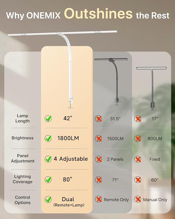 ONEMIX 42" LED Desk Lamp with Clamp, Architect Desk Light with Remote, Adjustable 4-Segment Bar, 1800LM Bright, Eye-Caring Desk Lamp for Home Office, Reading, Study, Dual Monitors, Workbench (White)