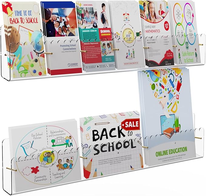 Brochure Holder Wall Mount, 2 Pack Acrylic Modular Flyer with Adjustable Magnetic Golden Bolt, Wavy Lace Pamphlet Display Stand for Organizer Trifold Flyer, Document, Leaflet, 6 Slots