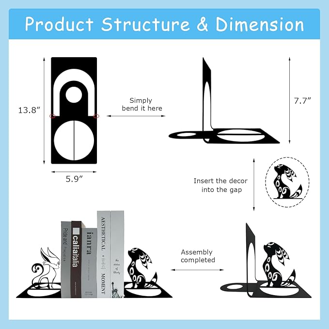 - Easy to Assemble: With no complex installation required, the package includes four components: two bookend bases that can be adjusted at the midpoint (refer to figure 4 for details) and two decorative pieces designed to fit seamlessly into the designated gaps on either side of the bookend structure