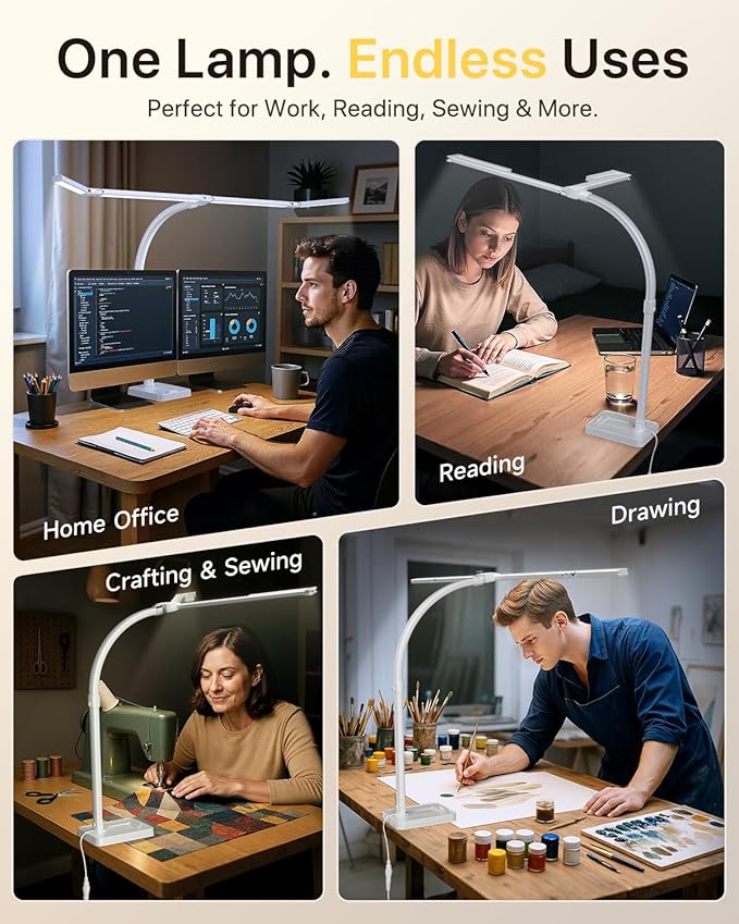 - Ultra-Wide & Super-Bright Light Bar: This 42-inch LED desk lamp features a 4-segment architect-style light bar with independently rotatable panels. Fold the segments inward for focused, task-oriented lighting—or swivel them outward to blanket up to 80 inches of workspace in wide, even illumination. With 1800 lumens of flicker-free brightness, it’s ideal for dual monitors, puzzle tables, sewing setups, and creative workspaces in home offices or dorms.