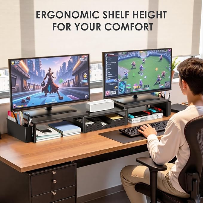 - 【Unlock Extra Space】Raise your monitor height with this monitor riser to free up space underneath. Store your keyboard, mouse, files, printer, gaming items, etc. neatly. Fits perfectly in any home, office, or dorm. Maximize desktop space and master desk organization