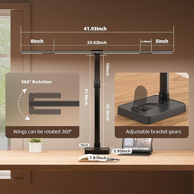 - 5 Joints for Ultimate Flexibility The foldable LED desk lamp is designed with 5 strong damping connectors and 4 super light strips, providing excellent flexibility for horizontal adjustment. Folding light strips to fine tune the lighting angle - raising them to expand the coverage of the entire table, or lowering them to obtain a focused high-intensity beam, is perfect for sewing, crafting, or detailed tasks, making it easy to adjust the direction and position of the lights to fit your workspace.