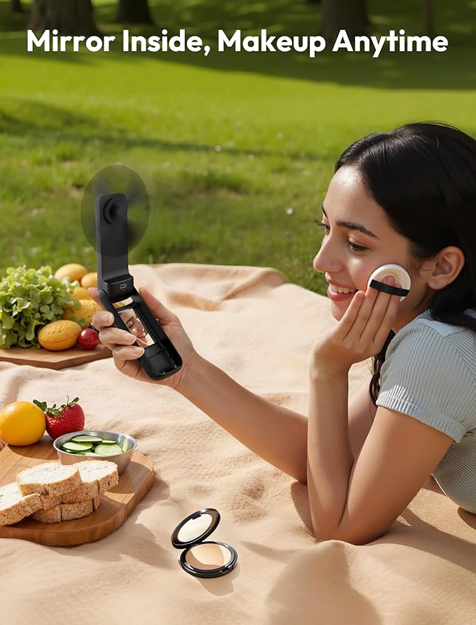 - Hidden Mirror Inside: Fan with a built-in hidden mirror—simply flip it open to check your makeup, fix your hair, or refresh your look anytime, anywhere. No need to carry an extra compact mirror in your bag. Perfect for travel, daily touch-ups, or on-the-go beauty moments.
