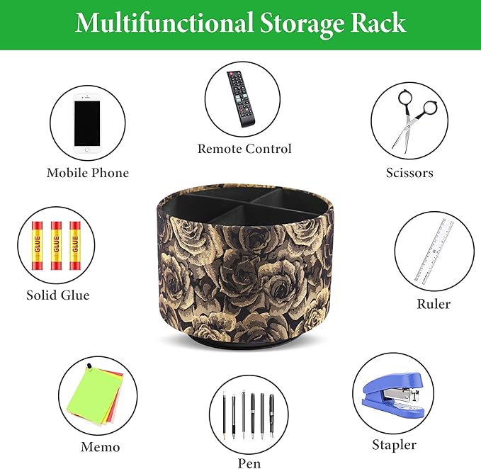 QIELIZI Round Leather Art Supply Organizer,Remote Control Holder,360 Degree Rotating,Multi-Functional Pencil Holder,4 Compartments Desktop Stationary Organizer(1-3D Rose Yellow)