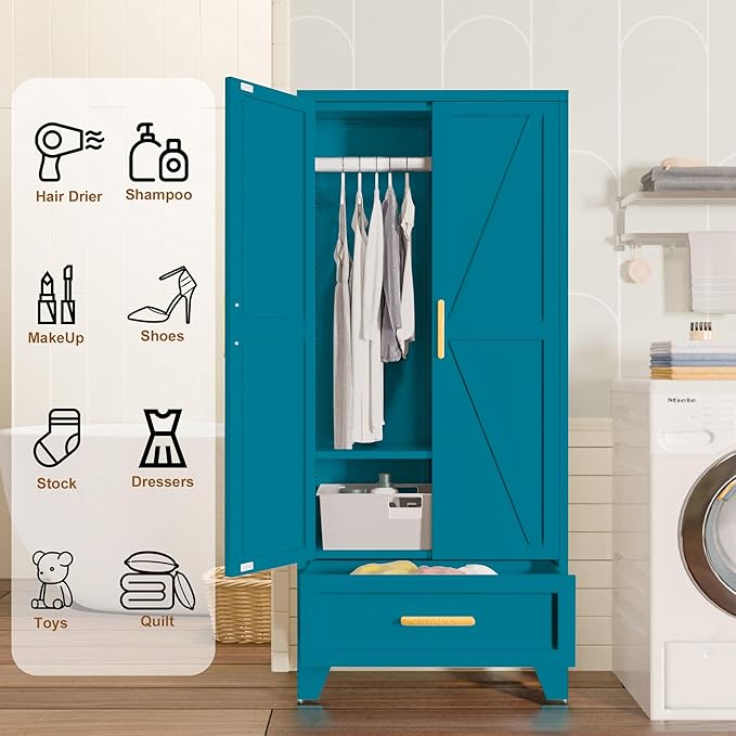 Metal Wardrobe Cabinet,71 Armoire Wardrobe Closet with Drawers and Hanging Rod,Metal Armoire with Adjustable Shelves for Closet,Bedroom,Farmhouse Storage Cabinet with Drawer(Blue)