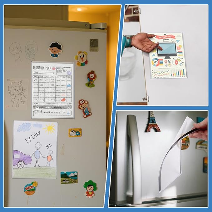 - Letter Size Sheet Protectors: Our magnetic document holders is 8.94" x 11.26" in outer size, 8.54" x 11.06" in Inner size, suitable for storing any paper no larger than 8.5x11 inches, the transparent material allows you to quickly identify and find documents, papers, photos, records, recipes, paintings, etc. and the paper can be displayed horizontally or vertically according to your needs