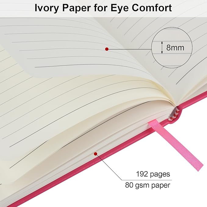 - Lined Journal Notebooks: 8 vibrant colors hardcover notebook, 192 pages/96 sheets per notebook, adequate for work, meeting, studying. The paper of the leather notebook is thick enough that ink won't bleed through. These journal notebooks are the ideal notebook for work, school, meeting, travel and diary