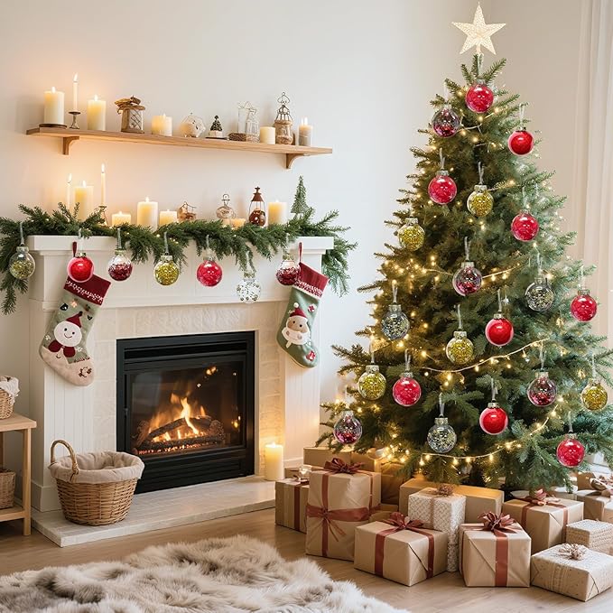 - Festive Designs: Our clear ornament set features 16 balls in 6 distinctive styles: 4 powder-filled, 3 fine-thread, 3 bead-filled, 2 feather-filled, 2 V-shaped glitter and 2 sequin balls. Red and Gold create a dynamic holiday color palette