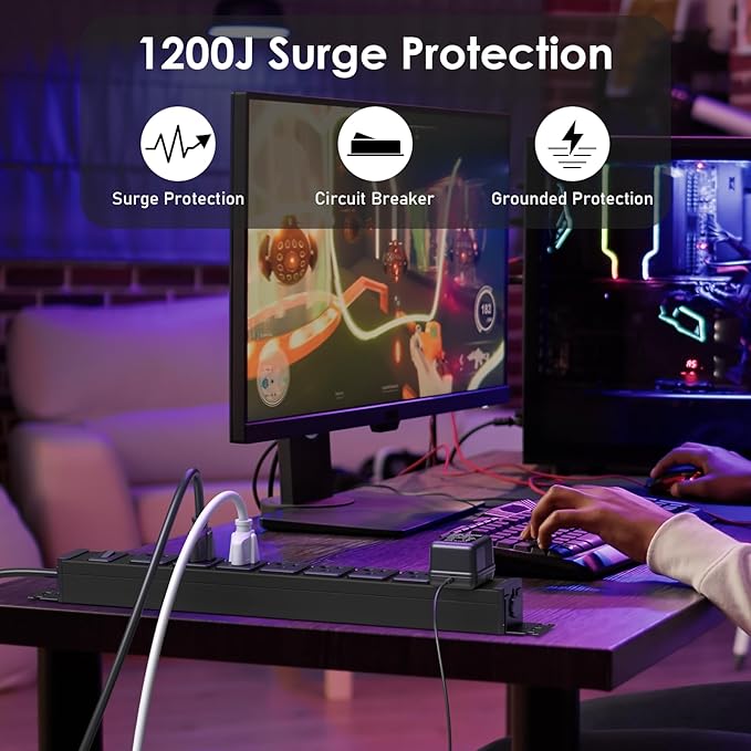 - 1200J Surge Protector: Sturdy power strip garage with overload protection, the reliable overload switch will trip off automatically to protect your devices when over-voltage, over-current, overload, high-temperature, short-circuiting.